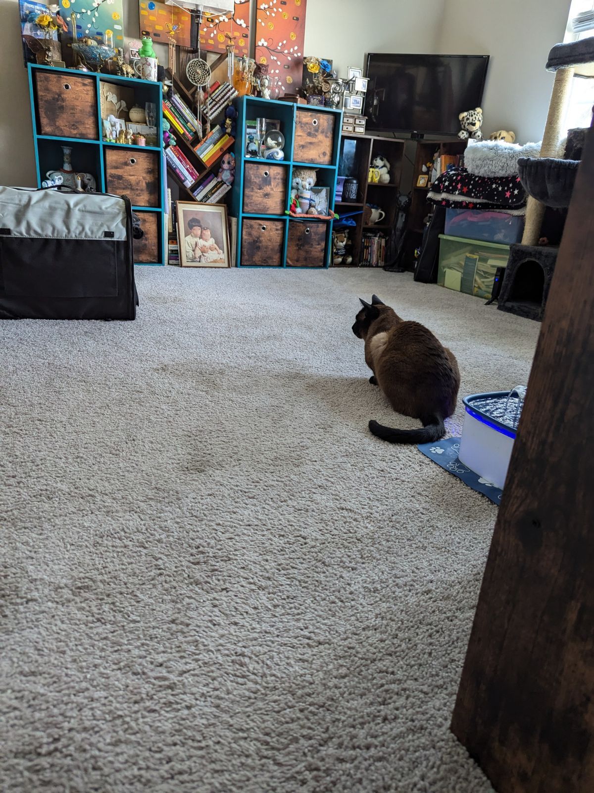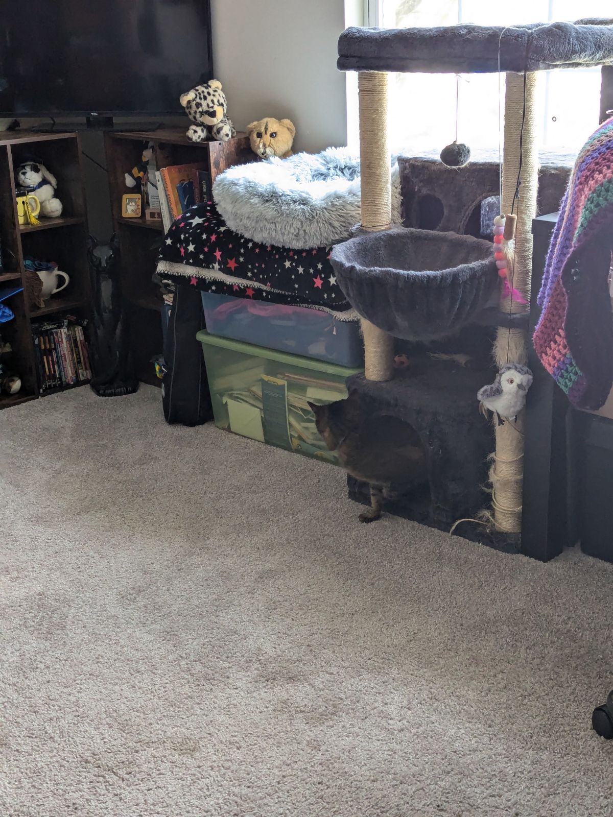 2:06pm: My humans discovered the suspicious tote is empty. They found the contents in the bottom house of my cat tree. I'm not sure how I felt about this.