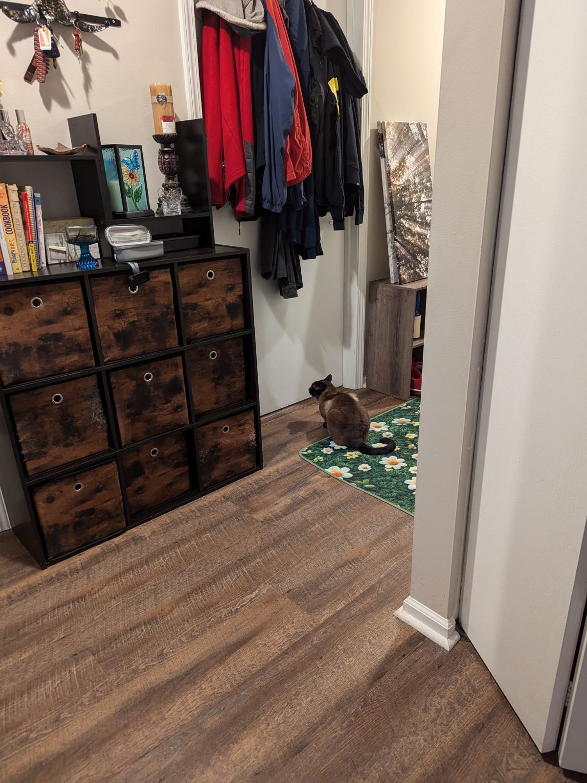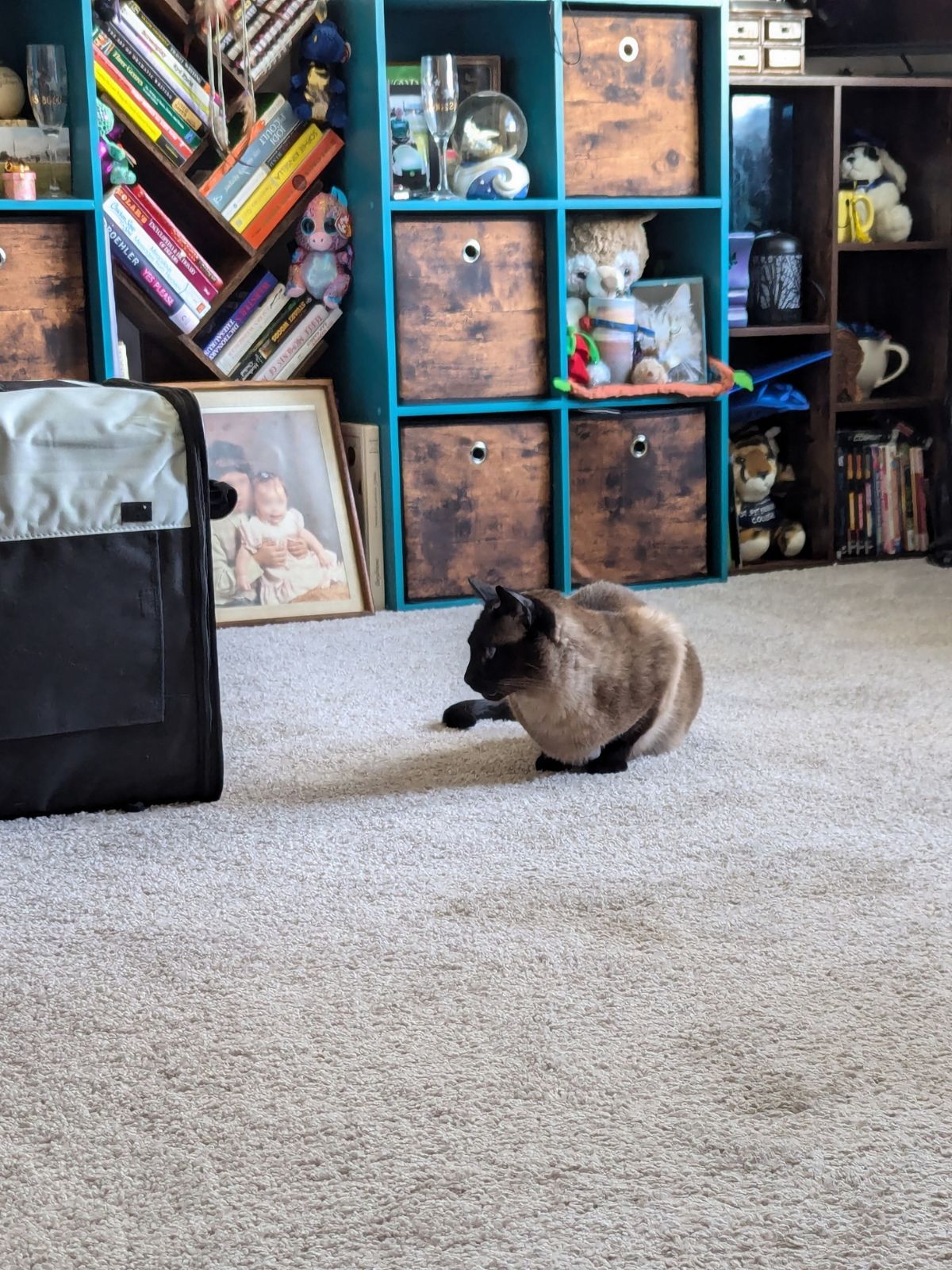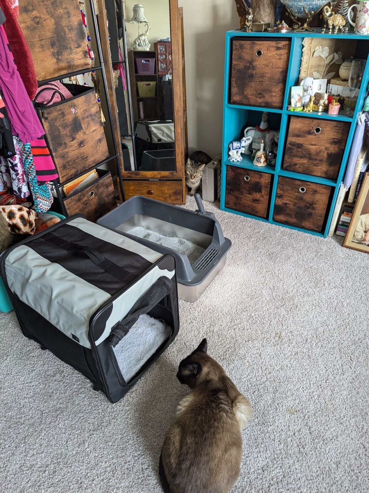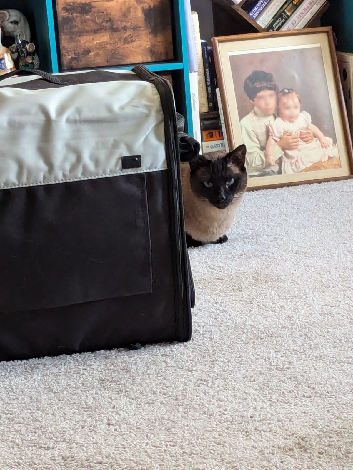 3:37pm: I'm repositioned outside of the front of the tote again. But Vinnie isnβt in there. He found a spot to hide behind the mirror, only peeking his head out to hiss.