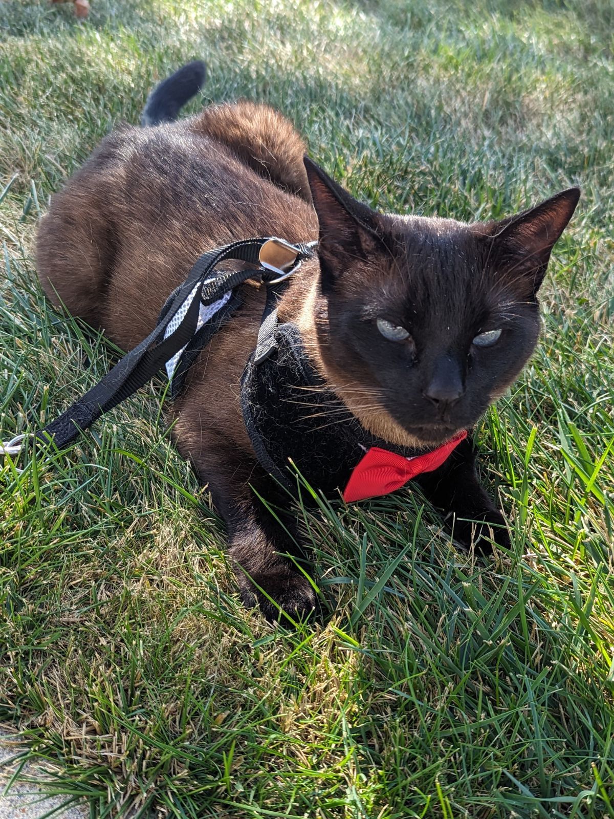 Me touching some grass in my tuxedo harness in October 2023 🌱