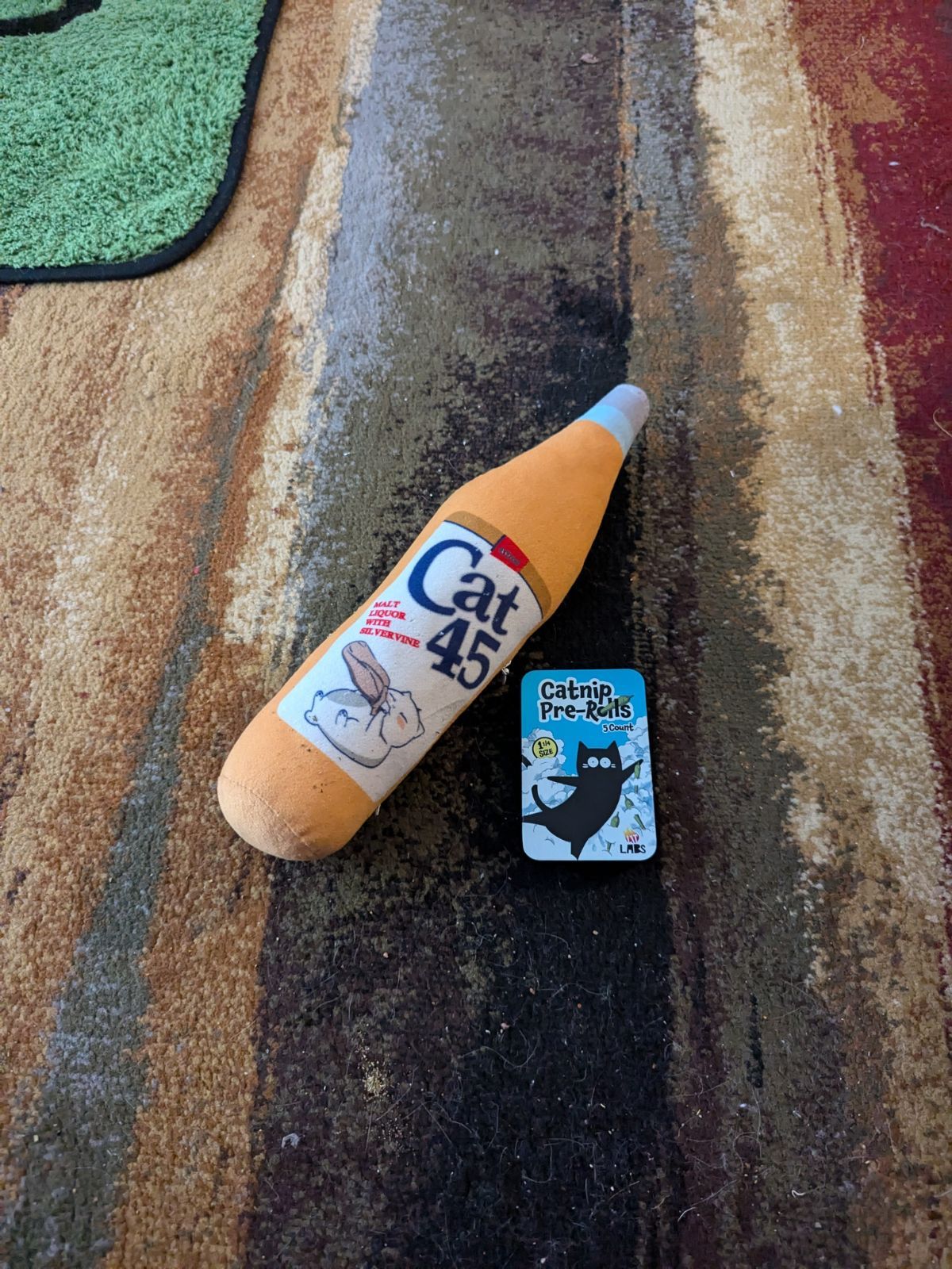 The Cat 45 and Purrona beer bottles are produced by TWINCRITTERS and feature a refillable zipper design β a detail that has served this household well across five years of repeat operations. The zig-zags are produced by LIT LABS. Both organizations clearly understand what cats need and have zero concerns about providing it.