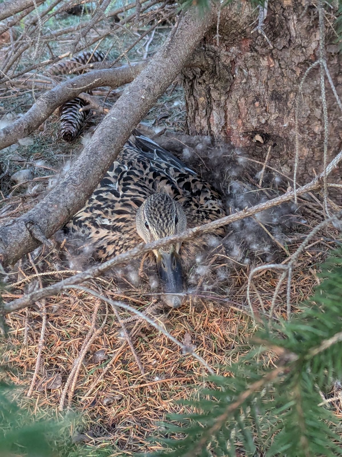 On the morning of April 9th, a second nest was discovered under the third pine tree in the same cluster. Mama #2 is well concealed. She is difficult to find with a camera. She is, however, present and on duty.