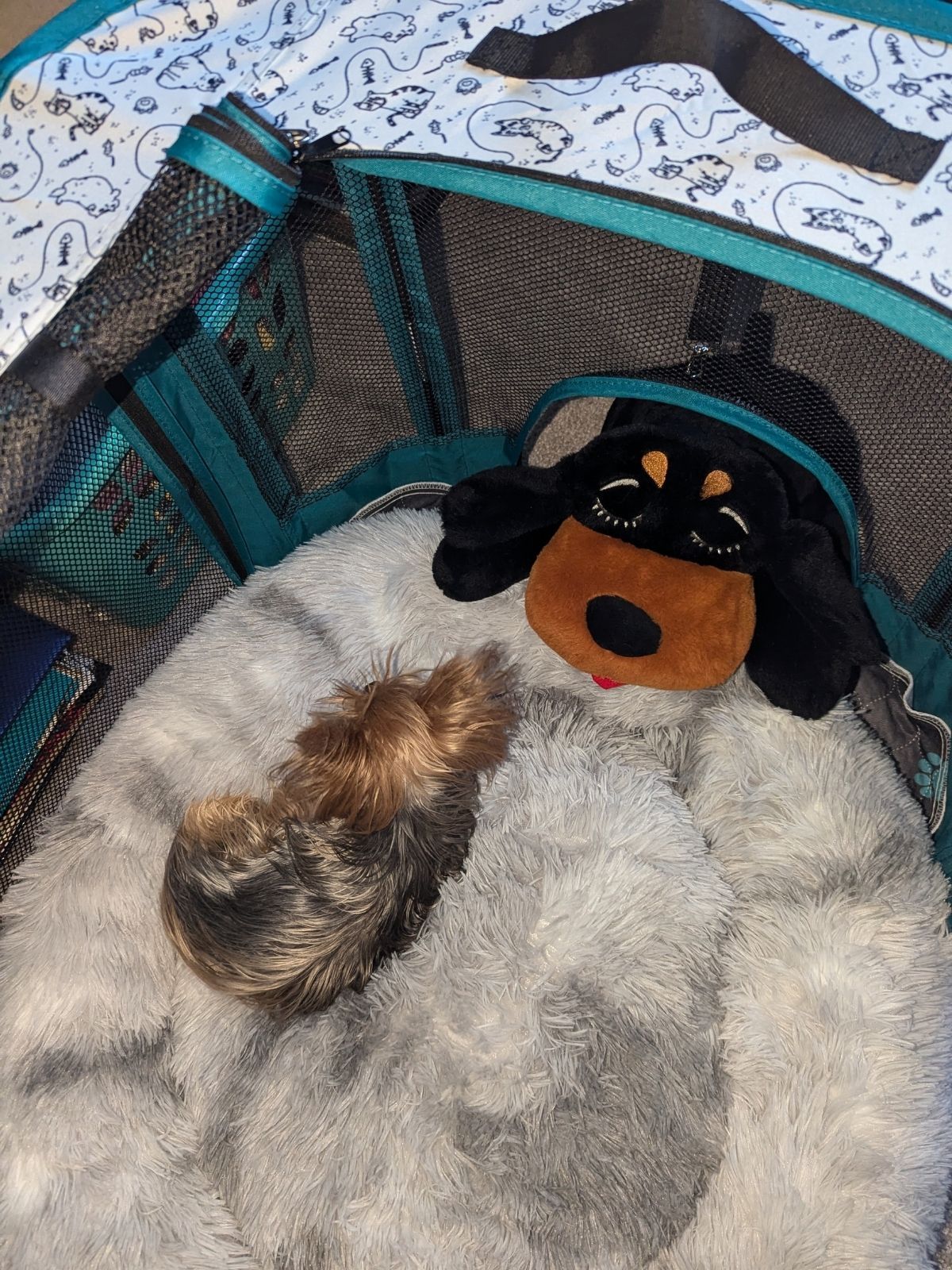 Me (Sammy) in the playpen on the big, fluffy round bed with Luna and her Carlos π