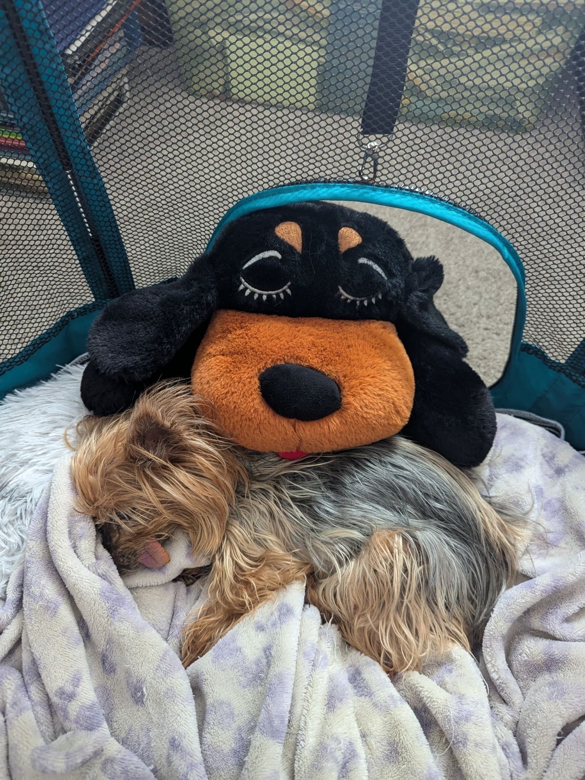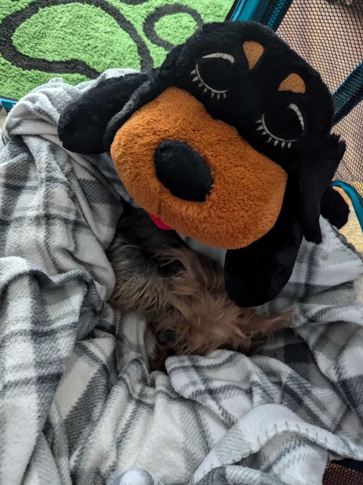 Stuffed Carlos poking his head in the playpen and lying it on Lunaβs back πΈ