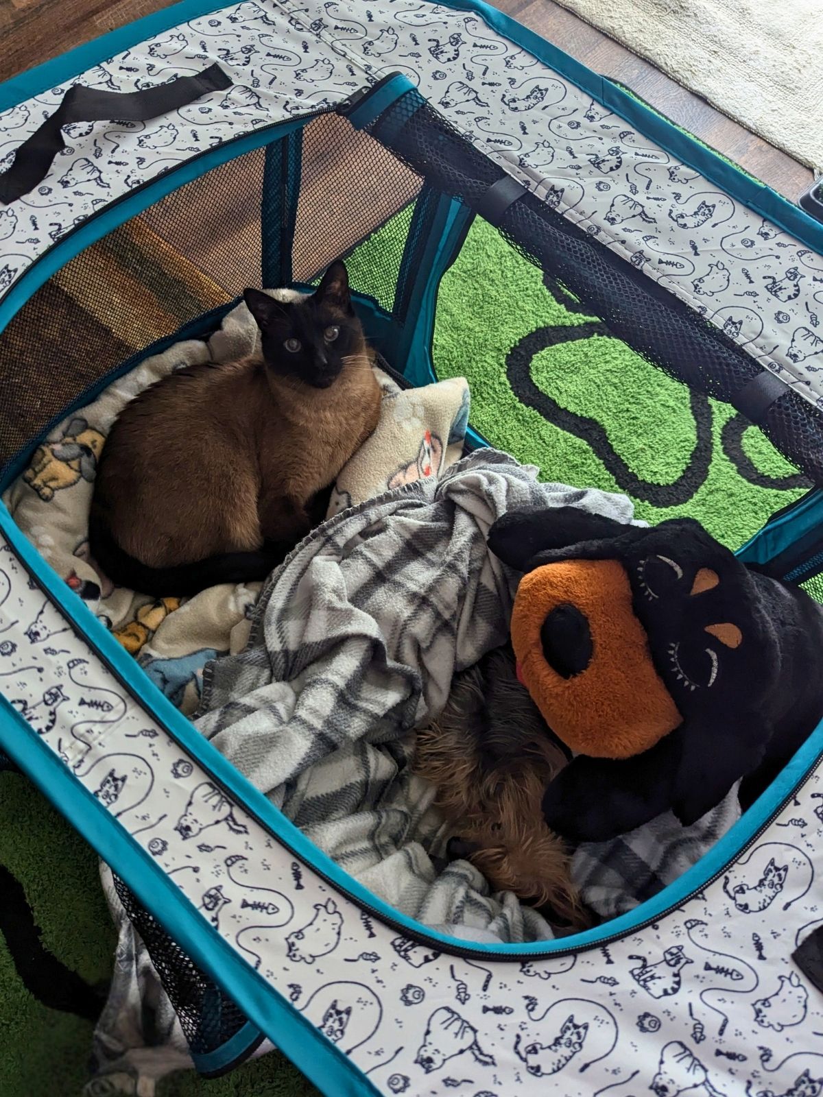 Me (Sammy) sharing the playpen with Luna and stuffed Carlos πΎ