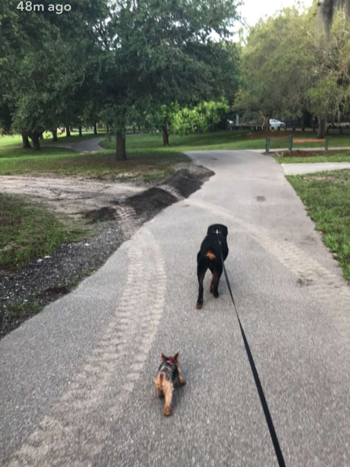 Luna following Carlos on a walk through the park π